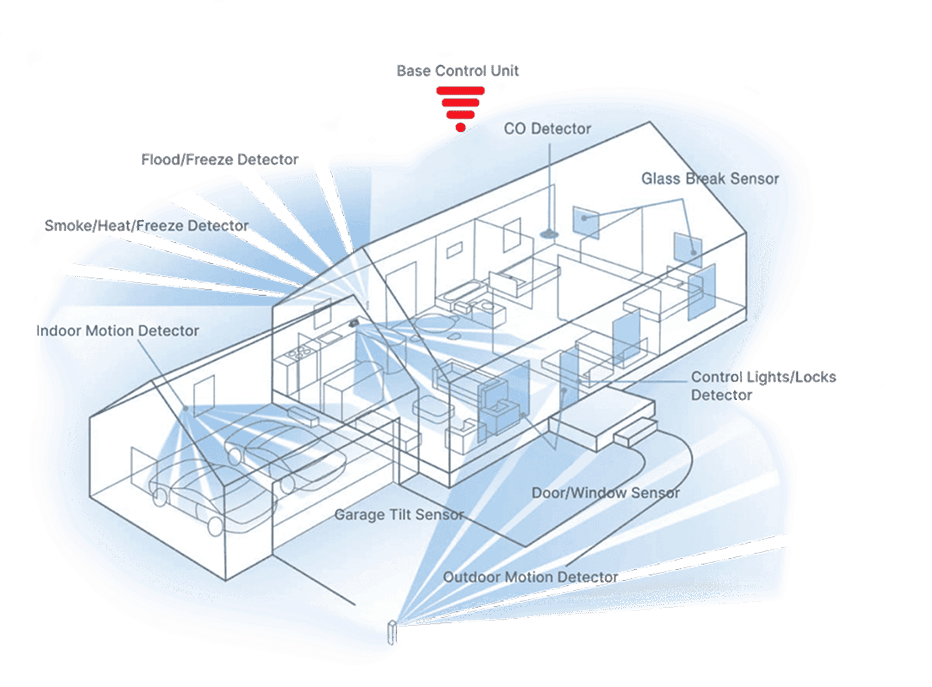 Wireless home protection against theft, fire, and water damage